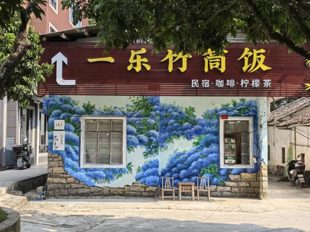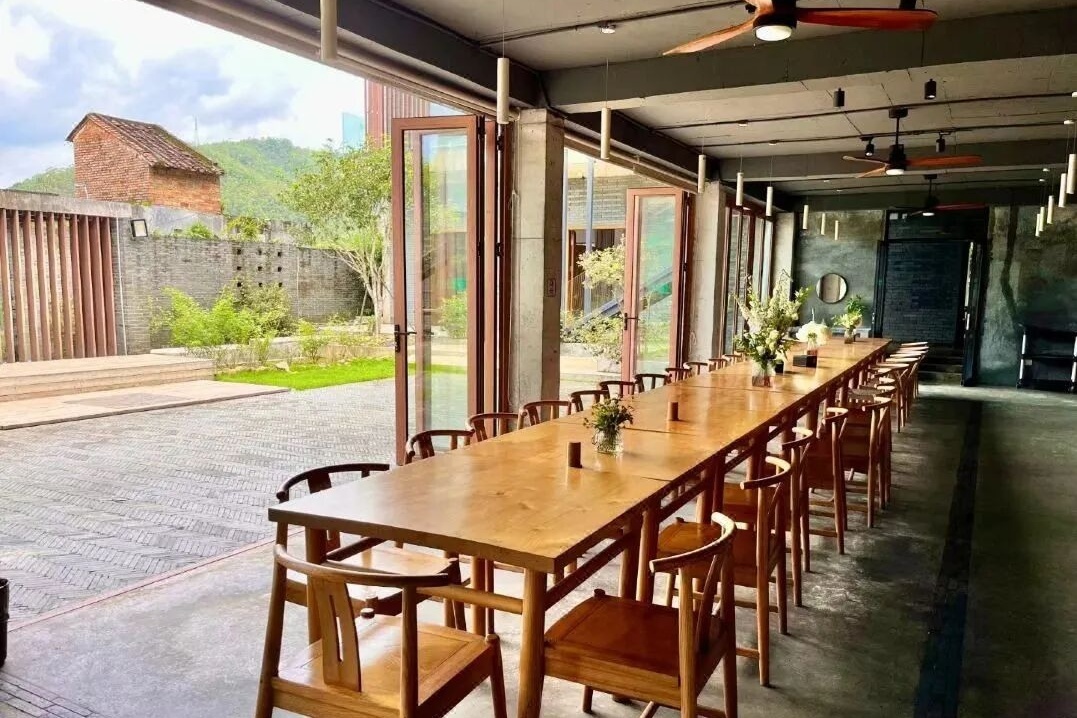 一乐民宿,依山而建,将极简造景融入自然,客家风味与现代简约碰撞——静谧雅致的庭院、古色古香的餐饮区,与周边乡村美景和谐共生。