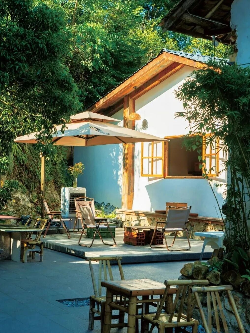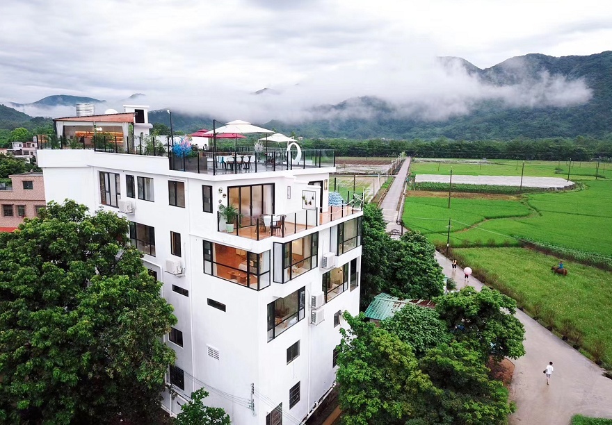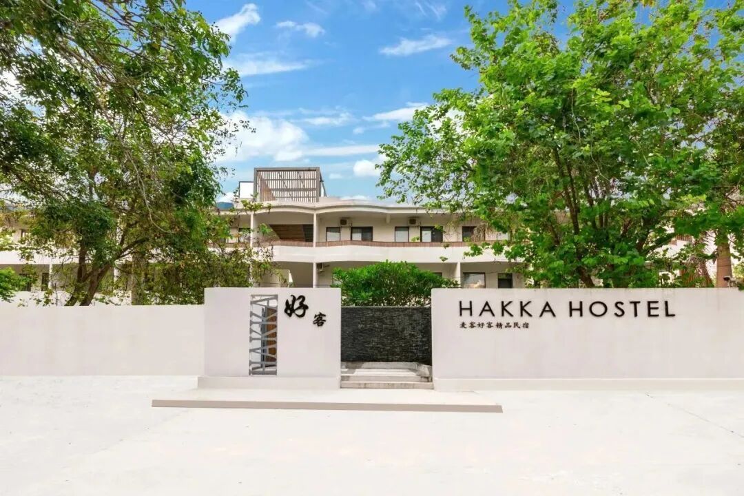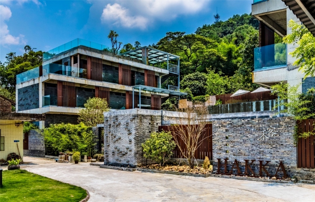 麦客和客精品民宿,隐匿于增城区派潭镇汉湖村的竹林荔枝树丛中,依山而建的“步步高”格局颇具巧思——左右两幢三层对称建筑搭配中间平房,木白灰主色调勾勒出清幽高雅的质感。