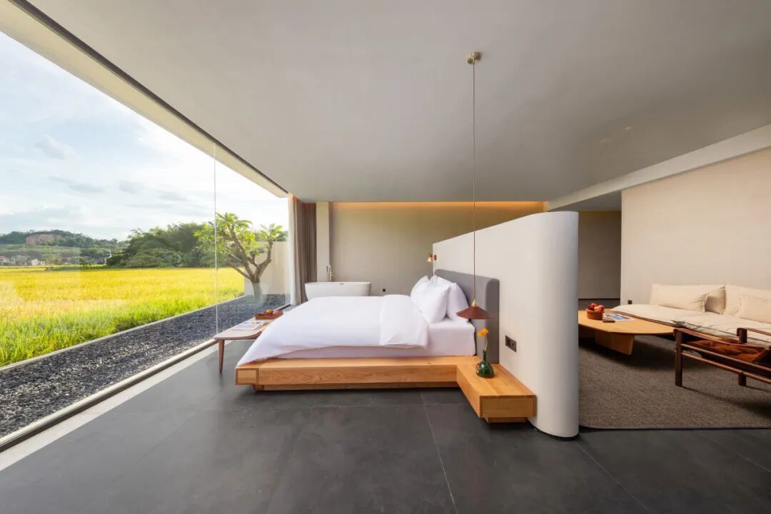 落地玻璃窗将田野风光框成动态画卷